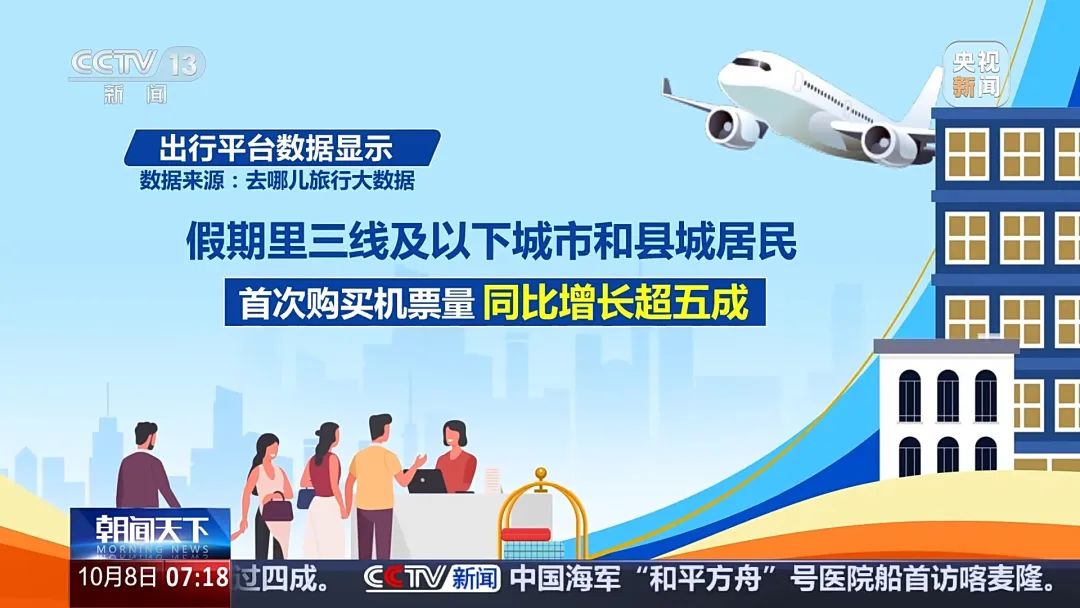 Travel is more convenient this holiday, with many cities building new airports and adding new routes to provide more choices for tourists. Data from travel platforms show that during the holiday, the number of first-time air ticket purchases by residents in third-tier and lower cities and county towns increased by more than 50% year-on-year, and the number of outbound travel orders increased by nearly 3 times year-on-year.