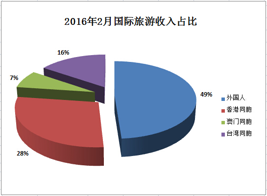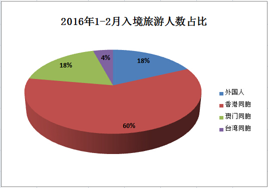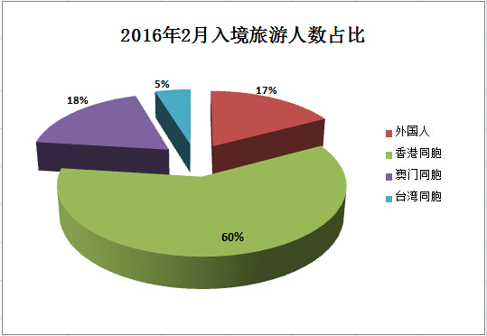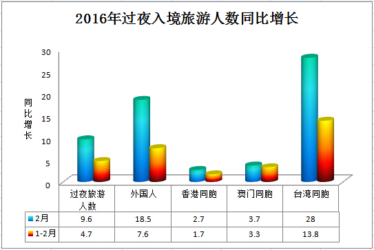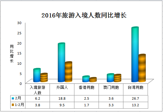 Inbound tourism in February 2016 Measurement Unit Monthly year-on-year growth %1-Monthly cumulative year-on-year growth %Number of inbound tourists 10,000 person-times 984.446.22095.283.8 Foreigners 10,000 person-times 169.7318.8378.499.5 Hong Kong compatriots 10,000 person-times 587.972.51250.561.7 Macao compatriots 10,000 person-times 179.913.6378.173.3 Taiwan compatriots 10,000 person-times 46.8226.788.0613.2