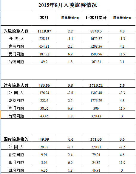 Inbound tourism in August 2015 Unit of measurement This month Year-on-year growth (%) 1-This month cumulative Year-on-year growth (%) Number of inbound tourists 10,000 person-times 1119.87 2.2 8748.5 4.3 Foreigners 10,000 person-times 228.13 -1.1 1675.37 -1.3 Hong Kong compatriots 10,000 person-times 654.81 2.2 5208.36 4.2 Macao compatriots 10,000 person-times 187.72 6.9 1500.96 11.9 Taiwan compatriots 10,000 person-times 49.2 1.8 363.81 3.1