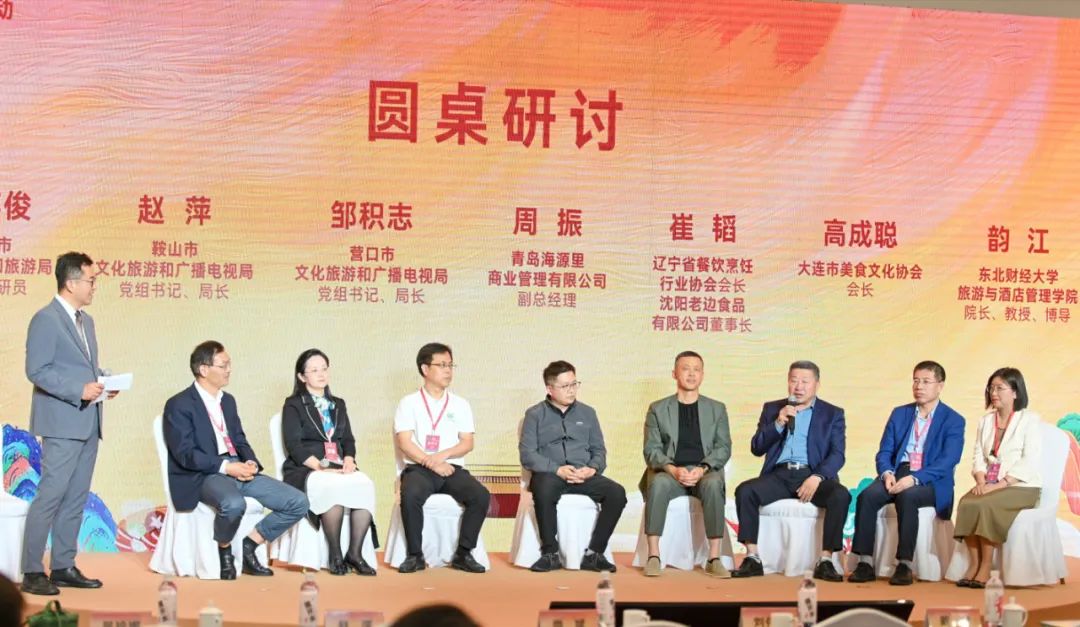 吴丰林所长主持了圆桌研讨。开封市文化广电和旅游局四级调研员张英俊,鞍山市文化旅游和广电局党组书记、局长赵萍,营口市文化旅游和广电局党组书记、局长邹积志,青岛海源里商业管理有限公司副总经理周振,辽宁省餐饮烹饪行业协会会长、沈阳老边食品有限公司董事长崔韬,大连市美食文化协会会长高成聪,东北财经大学旅游与酒店管理学院院长、教授、博导韵江,沈阳城市学院绿岛酒店管理学院院长、教授、全国饭店行业产教融合共同体副理事长付冰等专家和学者围绕美食旅游发展趋势、产业融合与创新、地方特色美食品牌培育、美食旅游人才培养等议题展开了热烈的讨论。