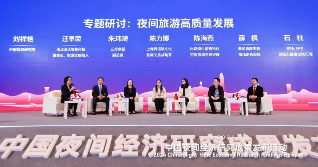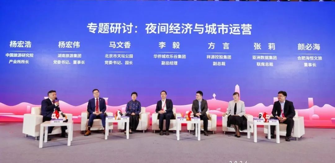 中国旅游研究院产业所所长杨宏浩主持了“夜间经济与城市运营”专题研讨,聚焦夜间经济发展与城市精细化运营等话题,与湖南旅游集团党委书记、董事长杨宏伟,北京市天坛公园党委书记、园长马文香,华侨城欢乐谷集团副总经理李毅,祥源控股集团有限责任公司副总裁方言,亚洲数据集团联席总裁张莉,合肥海恒文化旅游发展有限公司董事长颜必海进行了深入交流探讨。