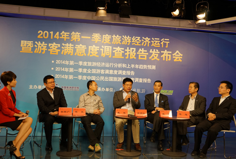 4月10日由中国旅游研究院主办,人民网旅游频道、旅游卫视协办的2014年第一季度旅游经济运行暨游客满意度调查报告发布会在人民网演播室举行。中国旅游研究院院长戴斌、中国旅游饭店业协会顾问、北京旅游行业协会副会长徐锦祉、蚂蜂窝网站创始人陈罡,易生旅游集团副董事长张浩等出席了发布会。来自人民日报、新华社、中央电视台、中国国际广播电台、人民日报海外版、经济日报、中国日报、中国新闻社、大公报、中国旅游报、人民网、中国网、央视网、旅游卫视、蓝海电视、中国旅游网、凤凰网等媒体机构代表也参加了发布会。