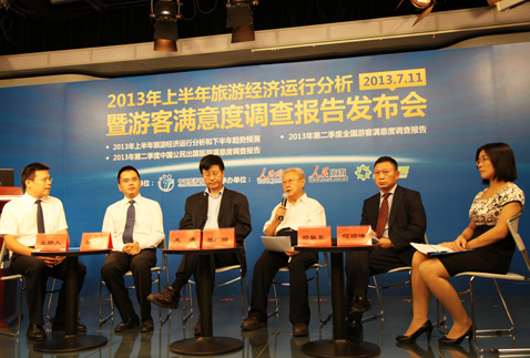 2013年7月11日由中国旅游研究院主办,人民网旅游频道、旅游卫视协办的2013年上半年旅游经济运行分析暨游客满意度调查报告发布会在人民网演播室举行。中国社会科学院旅游研究中心主任张广瑞研究员、北京市旅游发展委员会旅游环境与公共服务处处长王清、海航旅业战略与发展创新部总经理孙金伟先生、易生旅游旅游发展事业部总经理郑黎东、中国旅游研究院产业所所长李仲广副研究员等出席了发布会。来自人民日报、新华社、中央电视台、中央人民广播电台、中国国际广播电台、中国旅游报、经济日报、大公报、央视网、中国网、新浪网、搜狐网等媒体机构代表也参加了发布会。