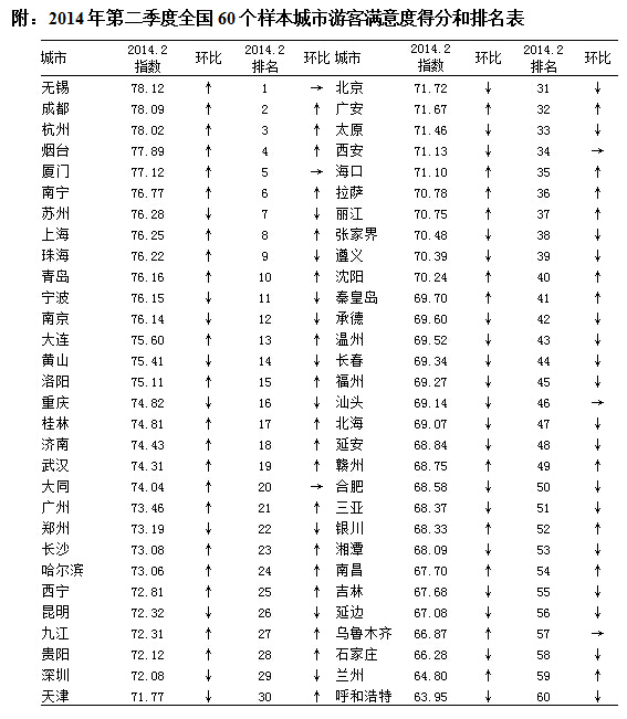 7月9日,中国旅游研究院发布2014年第二季度全国游客满意度调查报告。报告显示,2014年第二季度全国游客满意度指数为72.84,较第一季度上升0.22。报告指出,随着旅游市场秩序专项整治工作成效显现以及样本城市的持续努力,景点、旅行社等典型旅游行业的满意度开始回升,进一步拉动国内、入境游客满意度显著回升。但行业发展质量的"老问题"依然没有得到有效解决,安全、社会等因素呈现叠加影响的态势,出境游客满意度进一步下降。