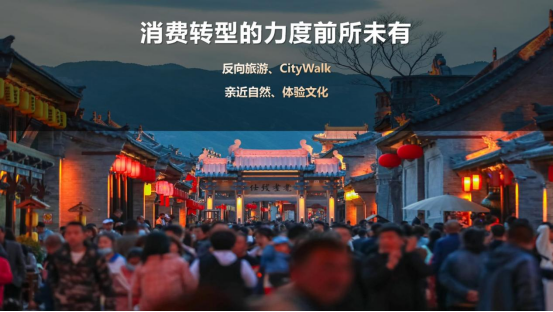 一是消费转型的力度前所未有。随着人们对美好生活向往的不断提升,文体旅游服务的消费场景不断创新。人们对于旅游业已经不再满足于传统的程式化、扁平化的“到此一游”,而是倾向于通过生活化、沉浸式的方式走进城市、漫步乡间,这是最近的一种新趋势。而年轻人则更热衷于反向旅游,CityWalk反映出他们对亲近自然、体验文化的向往和追求。
