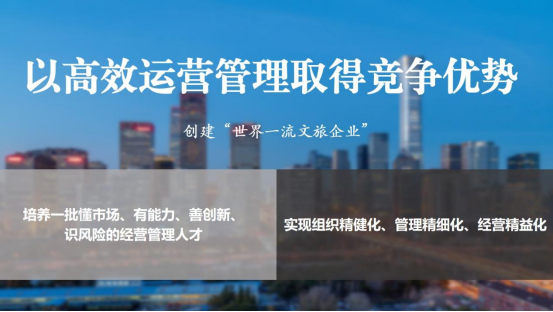 二是以高效运营管理取得竞争优势。当前,我们正在锚定目标,创建世界一流文旅企业,而高效的运营管理正是实现这一目标的基础。我们将继续推动经营与管理之间的良性互动,解决好传统产业转型升级与新型业态不均衡发展的问题,培育一批懂市场、有能力、善创新、识风险的经营管理人才,推动企业经营能力的整体提升。同时,我们进一步深入推动机构改革,不断强化成本控制、盈利能力、产业结构、市场营销等各方面的能力建设,持续推进深化国企改革提升行动,实现集团组织的精简化、管理的精细化、经营的精益化,不断激发企业活力。