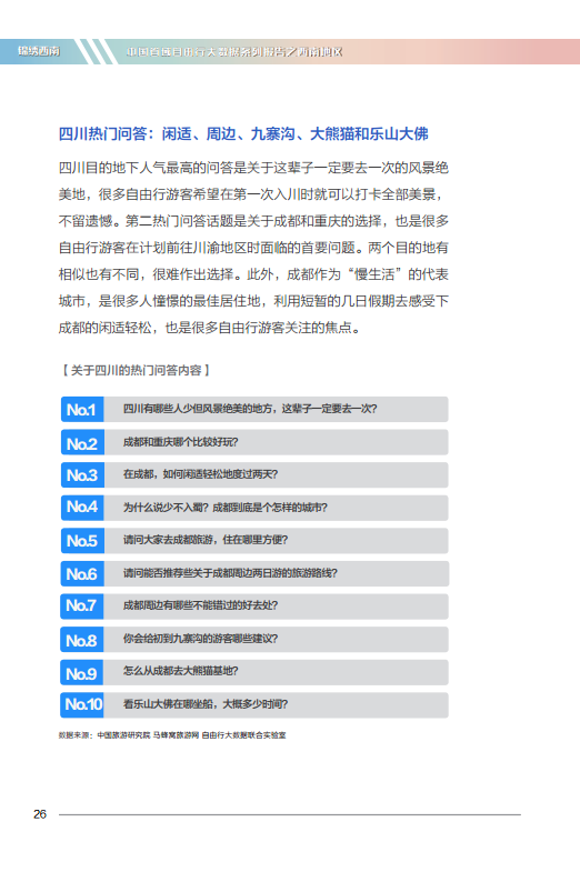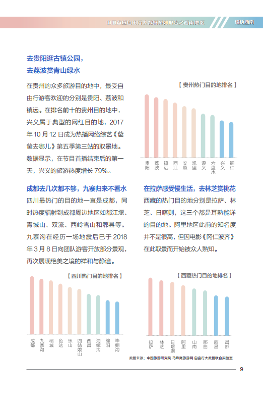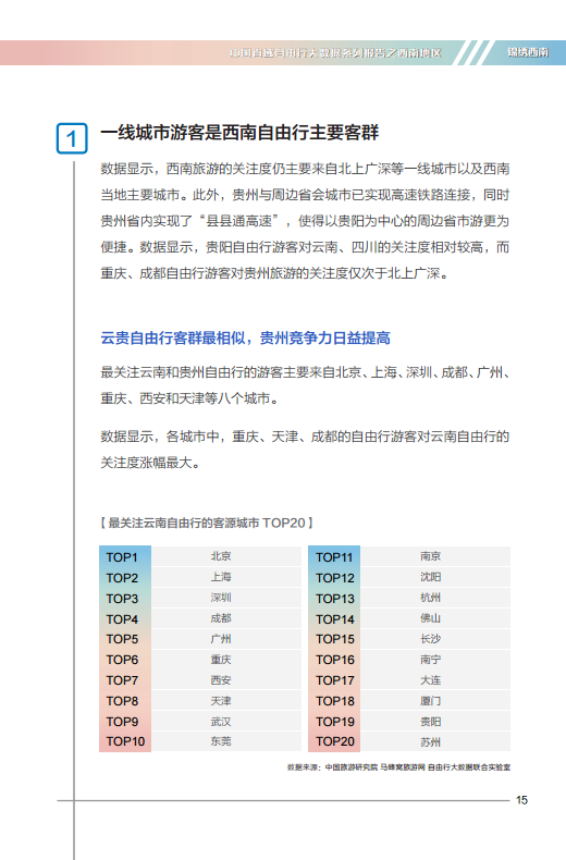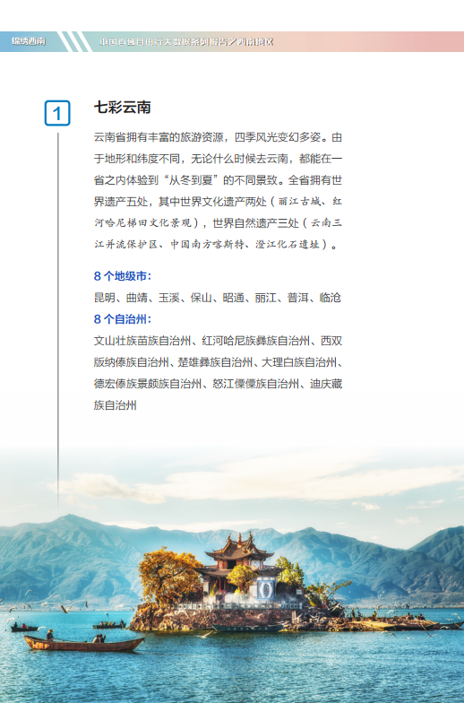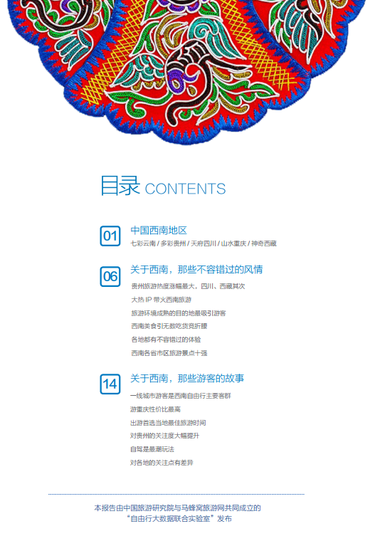 中国旅游研究院戴斌院长指出:随着消费经验的成熟,特别是智慧旅行的普及,自主化决策、自助旅游、自由行已经成为当前和今后一个时期旅游市场的基本特征。2018年5月24日,中国旅游研究院与马蜂窝旅游网联合成立的“自由行大数据联合实验室”发布了《锦绣西南——中国省域自由行大数据系列报告之西南地区》。