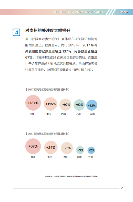 该报告以双方旅游大数据为基础,深度剖析了中国西南地区五省区市——云南、贵州、四川、重庆、西藏的旅游市场现状与未来发展趋势。报告显示,西南五省区市的旅游热度近年有大幅增长,自驾、古镇、美食成为西南地区最受旅行者关注的关键词。报告全文如下: