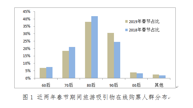 旅游过年追求生活品质。中国旅游研究院与银联商务联合实验室数据显示,2019年春节期间高品质住宿设施消费人次增长超过45.3%,较上年同期提高7.7个百分点。其中35-44岁之间的男性支付占比最高,达到28.1%。此外,2019年春节期间游客餐饮日均消费笔数较节前提高43.7%,其中80后餐饮消费总金额最高。中国旅游研究院与深大智能联合课题组研究发现,通过在线平台购买旅游吸引物门票的游客中,80后同样居于领先位置,与90后的差距明显缩小。